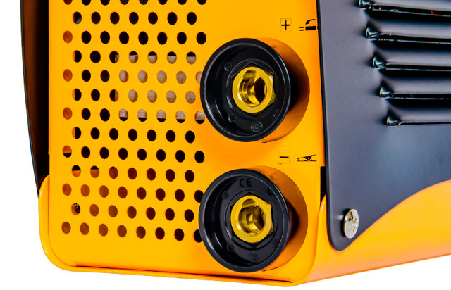 - Надійні байонетні роз'єми для підключення силових кабелів розміром 10–25 кв. мм забезпечують безпечне з'єднання без перегрівів, а також дозволяють швидко перемикати полярність для деяких видів зварювання.